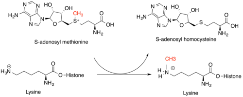 Histone methyltransferases are critical for genetic regulation at the epigenetic level. They modify mainly lysine on the ε-nitrogen and the arginine guanidinium group on histone tails. Lysine methyltransferases and Arginine methyltransferases are unique classes of enzymes, but both bind SAM as a methyl donor for their histone substrates. Lysine amino acids can be modified with one, two, or three methyl groups, while Arginine amino acids can be modified with one or two methyl groups. This increases the strength of the positive charge and residue hydrophobicity, allowing other proteins to recognize methyl marks. The effect of this modification depends on the location of the modification on the histone tail and the other histone modifications around it. The location of the modifications can be partially determined by DNA sequence, as well as small non-coding RNAs and the methylation of the DNA itself. Most commonly, it is histone H3 or H4 that is methylated in vertebrates. Either increased or decreased transcription of genes around the modification can occur. Increased transcription is a result of decreased chromatin condensation, while decreased transcription results from increased chromatin condensation.[4] Methyl marks on the histones contribute to these changes by serving as sites for recruitment of other proteins that can further modify chromatin.[5]