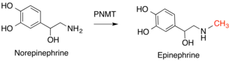 Important examples of this enzyme class in humans include phenylethanolamine N-methyltransferase (PNMT), which converts norepinephrine to epinephrine,[14] and histamine N-methyltransferase (HNMT), which methylates histamine in the process of histamine metabolism.[15] Catechol-O-methyltransferase (COMT) degrades a class of molecules known as catecholamines that includes dopamine, epinephrine, and norepenepherine.[16]