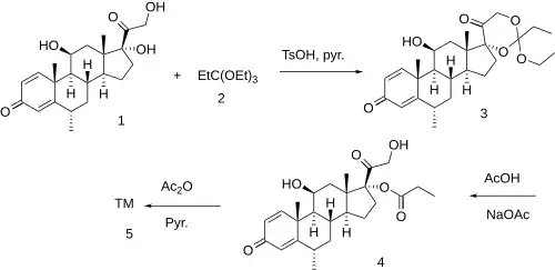 - ^ Sugai, S., Okazaki, T., Kajiwara, Y., Kanbara, T., Naito, Y., Yoshida, S., Akaboshi, S., Ikegami, S., Kamano, Y. (1985). "Studies on topical antiinflammatory corticosteroids. I. Syntheses and vasoconstrictive activities of 11.BETA.,17.ALPHA.,21-trihydroxy-6.ALPHA.-methyl-1,4-pregnadiene-3,20-dione 17-ester and 17,21-diester derivatives". Chemical and Pharmaceutical Bulletin. 33 (5): 1889–1898. doi:10.1248/cpb.33.1889.