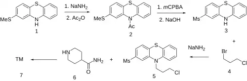 For the first step, 2-Methylthiophenothiazine [7643-08-5] (1) is protected by sequential reaction with sodium amide and acetic anhydride to give 1-[2-(Methylthio)-10H-phenothiazin-10-yl]ethanone [23503-69-7] (2). Oxidation with peracid proceeds preferentially on the more electron-rich alkyl thioether to give the sulfone. Upon hydrolysis of the acetate this affords 2-(methylsulfonyl)-10h-phenothiazine [23503-68-6] (3). Alkylation with 1-Bromo-3-chloropropane (4) gives 10-(3-chloropropyl)-2-methylsulfonylphenothiazine [40051-30-7] (5). Alkylation with piperidine-4-carboxamide (Isonipecotamide) [39546-32-2] (6) affords metopimazine (7).
