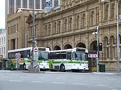 The MTT commenced operations with 43 trams, 63 trolleybuses and 17 buses in Hobart, 24 buses and 30 trolleybuses in Launceston and 16 buses in Burnie.[4][7] The MTT's first purchases were AEC Regal IVs.[31] Bedford SBs were purchased in the 1960s followed by Hino BT51s, Leyland Nationals, Volvo B58s, Volvo B10Ms, Mercedes-Benz OH1316s and Scania N113s followed.[4][32][33] More recent purchases have been Bustechs assembled locally by Elphinstone Engineering.[34][35]