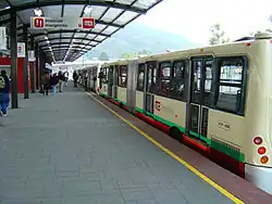 The first metrobus service began along the northernmost portion of Line 1 on 19 June 2005.[9] Initial service was from Metro Indios Verdes south to Metro Insurgentes. This was quickly followed by a southward expansion from Metro Insurgentes to MB station Doctor Gálvez, bringing the line length up to 20 kilometres (12 mi). Many of the stations along Line 1 feature cantilevered glass canopies designed by architect Carlos Monge.[10]