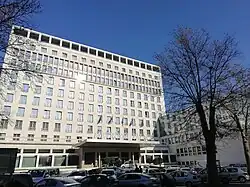 During the Interbellum, the lot was planned for the University Center, which ultimately wasn't built.[4] Projected as the House of the Central Committee of the League of Communist Youth of Yugoslavia after the war, the building was originally envisioned as the "largest congress center in the Balkans". Construction was part of the vast program of the Youth work actions and began in the summer of 1949. Some 15 youth brigades, with 18,000 people, were employed at the construction site but the works ceased in November 1950.[5] The building was envisioned as the massive structure, which was to have a pedestrian pathway to the Saint Mark's Church, and to "dominate this part of the city" as the "etalon of the new architecture's superiority".[4]