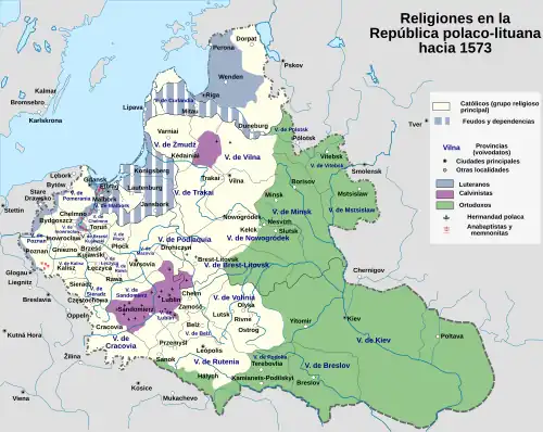 In 1569, the Polish–Lithuanian Commonwealth was established. The Warsaw Confederation of 1573 secured the rights of minorities and religions;[16] it allowed all persons to practice any faith freely. However, in the eastern territories, the aristocracy was mainly Polish and they carried out a policy of Polonization of their peasants, the majority of whom were neither Polish nor Catholic. At the same time, colonization of the eastern territories (nowadays roughly western and central Ukraine),[17] heightened tensions among nobles, Jews, Cossacks (traditionally Orthodox), Polish and Ruthenian peasants.