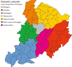 The Metropolitan City of Bologna (Italian: città metropolitana di Bologna) is a metropolitan city in the Emilia-Romagna region of Italy. Its capital is de facto the city of Bologna, though the body does not explicitly outline it.[5] It was created by the reform of local authorities (Law 142/1990) and established by the Law 56/2014, replacing the province of Bologna. It has been operative since 1 January 2015.