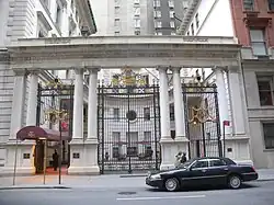 The site has a frontage of 100 feet (30 m) on Fifth Avenue and 200 feet (61 m) on 60th Street, at the northeast corner of these two streets.[32] It faces Central Park and Grand Army Plaza to the west,[3][12][185] the Pierre hotel to the north, and the Park Cinq building and the Sherry-Netherland hotel to the south.[186][187] Stanford White of McKim, Mead & White designed the original building[8][188] in the Italian Renaissance style.[34][185] White also designed custom-made torchères on the sidewalk outside the clubhouse.[189] The design of the clubhouse may have been patterned after various Italian palazzi,[190] as well as palazzo-style English clubhouses.[12] The east wing, erected in 1912, was designed by Ogden Codman Jr.[191][192][193]