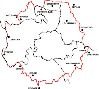 In 1946 the Metropolitan Police District was somewhat redrawn by the Police Act 1946, to match the then local government boundaries. The boroughs of Dartford and Watford, the urban district of Caterham and Warlingham and the parish of St. Peter Rural were wholly excluded from the District; whilst the borough of Epsom and Ewell, the urban districts of Banstead, Cheshunt, Coulsdon and Purley, Crayford, Esher and Orpington were brought wholly within the district.[2] The definition, in the Fourth Schedule is as follows:[3]