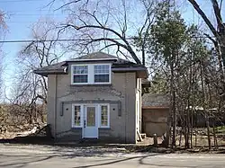 In March 1923, Glen Echo terminal was opened at the city limit at Yonge Street and Glen Echo Road. The terminal had a two-storey, buff-coloured building with Spanish roof tiles. The building had passenger and baggage facilities on the first floor and offices on the second. There was a nine-metre wide platform between the radial and streetcar tracks to facilitate transfers.[15] The site was also home to the Glen Echo Carhouse.