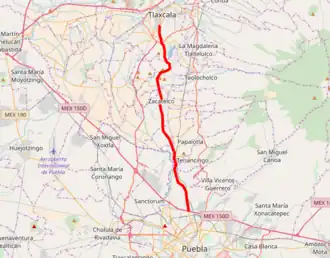 Federal Highway 119 (Carretera Federal 119) is a Federal Highway of Mexico.[3] Federal Highway 119 is split into two segments: the first segment travels from Tejocotal, Hidalgo in the north to Apizaco, Tlaxcala in the south. The second segment travels from Tlaxcala City in the north to Puebla City in the south.