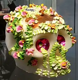 Ceremonial objects are produced in every region of the country in all different shapes, sizes and colors, whose sole purpose is to celebrate saints and holidays and honor the dead.[6] One of the major holidays for artesanía is Day of the Dead. Objects are created to decorate houses and create “ofrendas” (altars to the deceased) such as candy skulls, decorated skeletons, many of which are dressed to imitate professions such as doctors.[41] Large quantities of flowers and other plant matter to create decorations for ofrendas and for graves.[42] There is also a special burnished black pottery which is used for objects related to the Day of the Dead.[29] Another major holiday for crafts is the Christmas season, where sales of piñatas peak and ornate nativity scenes are constructed in homes. For Palm Sunday, intricate crosses are woven from palm fronds. In some places in Mexico during Holy Week, large papier-mâché effigies of Judas Iscariot are ritually burned. For the feast days of patron saints, cut paper banners are strung over roads and hung in windows.[42]