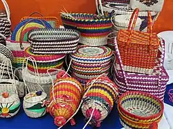 Weaving is a craft practiced by men, women and children in Mexico and just about every fiber available is crafted into utilitarian objects such as placemats, baskets, hats and bags. Many of the materials used are left in their natural color but some can be dyed vivid colors. In addition, plastic fibers are beginning to be used.[36]
