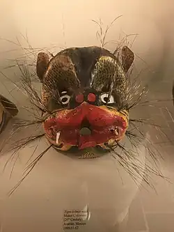 Another prominent animal is the jaguar or ocelot, often mislabeled as a “tiger” in the various dances that feature it. This character appears in Morelos, Puebla, Guerrero, Oaxaca, Chiapas and Tabasco in dances such as Tecuanes, Tlacololeros, Tejonrones, El Calalá or El Pochó. The behavior of this tiger character varies from fighting to being pursued by hunters, but the symbolism is most often related to the agricultural cycle and the rainy season on which it depends.[11][54][55] Tiger masks typically range from small to the size of the human face, with some far larger where the dancer looks out through the jaws.[52] The mask may cover only the face or be a leather or cloth helmet and complement a full costume.[54][56]