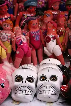 After the Mexican Revolution a number of aspects of traditional Mexican life became revalued, including traditional and rural handcrafts.[17] Today, masked festivals and dances are most prevalent in areas of the country with large concentrations of indigenous peoples.[18] Sophisticated masks made by saint makers still can be found in the states of Tlaxcala, Puebla, Oaxaca, Chiapas and Michoacán, but in most areas masks are made by lesser craftsmen.[18] Past history and customs live on in traditional dances. These include the Conquest, Independence, and the Battle of Puebla, using masked characters.[19]