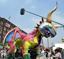 The event is alternatively known as La Noche de los Alebrijes (Night of the Alebrijes), and the Desfile y Concurso de Alebrijes Monumentales del MAP (Monumental Alebrije Parade and Contest of MAP).[1][2] The parade and contest is organized by the Museo de Arte Popular, in collaboration with the federal and city secretariats of culture, the authorities of the historic center of Mexico City, the Consejo Nacional para la Cultura y las Artes, the Associación de Amigos del MAP and the BBDO company.[1][3] Its purpose is a homage to Mexican handcrafts and folk art, especially cartonería (a kind of very hard paper mache) in order to restore value to it in modern society.[4][5] In the spring or early summer, the Museo de Art Popular puts out an open call for participants, inviting individual artists and artisans along with museums, galleries, hotels, restaurants, businesses and public and private institutions.[4][6] Notable artisans who have participated include Arturo Caballero Arroyo, Ricardo Hernández, Esteban G. Vargas, Laila Yamille Sabag, Enriqueta Landgrave Zamora and Fabián Hernández. Alebrijes have been sponsored by organizations such as CONACULTA, el Taller Los Olvidados, El FARO de Oriente, Arte en Papel, the Centro Cultural Xavier Villarrutia, Librarte, Arte Mexicano para el Mundo and the Mexico City Secretariat of Culture.[5]