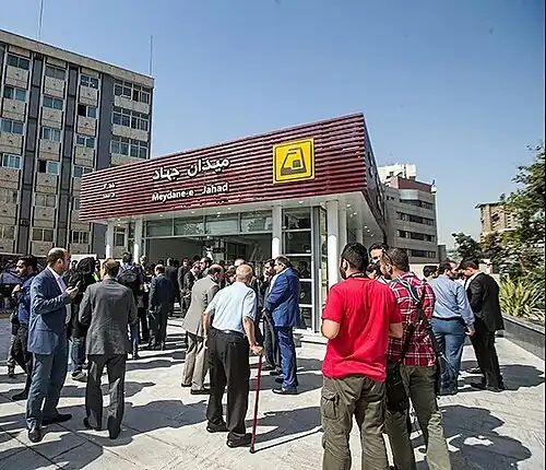 Meydan-e Jahad Metro Station is a station in line 3 of the Tehran Metro.[1][2] It is located at the intersection of Valiasr Street and Fatemi Street. The station was planned to be named "Meydan-e Jahad" prior to opening, however, just one day after the official opening, the name was changed "Shohada-ye Resaneh" for the first two months of its operation. However, due to popular complaints about the new name not being reflective of any nearby geographical feature, and the name being unfamiliar to most users, the name was reverted to the initially planned name. This name change cost the Metro Organization about 2 billion tomans.