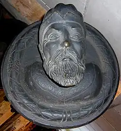 Gerhard (II), also known as Gert, died in 1655. A permanent activity in Stockholm started with him, a son of Johann (I). Born in Riga and at his father's death in 1610 still underaged,[40] he got his formation by his master (and possibly stepfather[41]) Medardus Gessus. In 1621 Riga was conquered by the Swedes and in 1623 Gessus was appointed head of the Royal cannon foundry in the Swedish capital. Gerhardt is mentioned amongst Gessus’ assistants in the same year.[42] He later became the leading bronze caster to the Swedish Crown. The challenging industry of bronze cannons (in 17th century Swedish called "Stycke") was one of the key military tasks at the time. Meyer established well in his new homeland; in 1635 he married Maria von der Linde,[43] daughter of Erich Larsson von der Linde, one of the richest merchants in town. Gerhardt (II) owned a house in the city and had his own seat in the German Church, Stockholm St. Gertrud's.[44] He made proposals to Queen Christina to improve the founding industry.[45] In 1641 he was appointed head of the Royal foundry by the Queen.[46] On this occasion the old foundry in Brunkeberg near St. Klara church was rebuilt in order to provide the master with a modern workshop.[47] Unlike his predecessors as founders of the King of Sweden, Gerhardt owned the foundry.[48] Besides cannon-casting, bell-casting was an important source of income, particularly in times when there was little need for artillery. The king passed a decree to allow his cannon casters to cast bells.[49] In 1655 Meyer was granted the permission to cast not only for the Crown but also for important aristocrats.[50] He was rich enough to rebuild the foundry at his own expense after it was destroyed by fire.[51] In 1647 he executed the bronze cast of a man wielding a whip for the pillory on Stortorget square, the so-called "Kopparmatte" after a model by the German “bilthacker” (wood sculptor)[52] Jost Henne or Martin Redtmer.[53] This was the first bronze statue ever cast in Sweden; today it is in the collection of the Stockholm Stadtsmuseet.