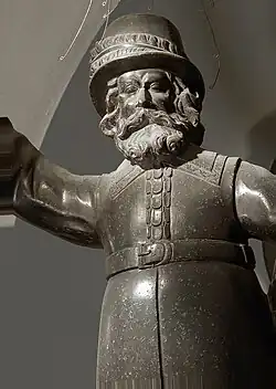 Gerhardt (IV) lived from 1667 until 1710. As a son of Johann (IV) he was born in 1667.[64] He got his formation in his father's and in his stepfather's workshop before travelling as a journeyman to Germany to continue his training.[65] Business had become tough by then. Whereas Gerhardt's ancestors and predecessors in charge of the Royal foundry had their major commissions due to the modernisation of Swedish artillery, it seems that the implementation of modern cannon types had been mostly completed at the time.[66] Furthermore, there was in Sweden a notorious lack of copper since the 1640s, severely restricting the production of cannons.[67] Yet, the king's ambitious plans for the embellishment of the new residence opened new fields of activity. Since 1693 there were ongoing construction works for a new Royal Stockholm Palace after the plans by Nicodemus Tessin the Younger. For that purpose, a whole team of French artists and artisans came over the following years to Stockholm, including the French caster Jean Hubeault who made ornamental casts for the decoration of the palace.[68] It was planned to decorate the new palace with monumental bronze sculptures. Casting bronze sculptures was a task so far unknown in Sweden. The only exception had been the above-mentioned Kopparmatte, which from a technical point of view is merely a rather rudimentary achievement.
