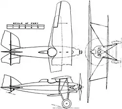 The Midget was a small, low-powered single-seat sesquiplane with some unusual features. Its lower wing had 75% of the span of the upper one and close to 75% of its chord. The upper wing was raised above the fuselage, as with most biplanes, but on a slim, faired pylon rather than by the usual cabane struts. The lower wing was similarly mounted clear of the fuselage underside. The Midget was a single bay biplane with vertical V-form interplane struts; unusually, it also had pairs of parallel lift struts from the lower fuselage longerons to the upper wings at the same points as the interplane struts, instead of interplane wires. The wing struts were of steel, faired in balsa wood. An advantage gained by mounting the wings clear of the fuselage was that the two channel spruce spars of both could run from tip to tip without interruption. In plan, both wings were straight tapered; only the upper planes carried ailerons. The wings were fabric covered.[1]