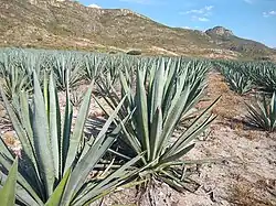 The Agave genus is a member of the Agavoideae subfamily of the Asparagaceae plant family (formerly included in the now defunct Agavaceae family) which has almost 200 species.[28] There are more than 120 species of agave.[29] The mezcal agave has very large, thick leaves with points at the ends. When it is mature, it forms a "piña" or heart in the center from which juice is extracted to convert into mezcal. It takes between seven and fifteen years for the plant to mature, depending on the species and whether it is cultivated or wild.[30] Agave fields are a common sight in the semi-desert areas of Oaxaca state and other parts of Mexico.[5]
