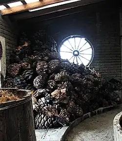 The process begins by harvesting the plants, which can weigh 40 kg (88 pounds) each, and extracting the piña, or heart, by cutting off the plant's leaves and roots.[5] The piñas are then cooked for about three days, often in pit ovens, which are earthen mounds over pits of hot rocks. This underground roasting gives mezcal its intense and distinctive smoky flavor.[40][37] They are then crushed and mashed (traditionally by a stone wheel turned by a horse) and then left to ferment in large vats or barrels with water added.[5]