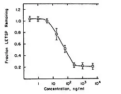 The shape of the fibronectin-decrease curve is more usual, although not quite: the separate parts of the curve are all more or less linear, which is not the case in an S-shaped curve. In this case, a maximum dose can be determined: above concentrations of about 103 ng/mL the effect remains more or less stable. A NOAE-level is visible for concentrations of up to 1 ng/mL of mezerein. The concentration that gives half-maximal effect is approximately 90 ng/mL. The difference with the half-maximal concentration for 2-DG transport is remarkable. Mezerein causes a 46-fold lower effect for fibronectin decrease than for 2-DG stimulation, and apparently only causes this effect at high concentrations. This might also correlate with mezerein being a weak tumor promoter.