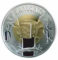 Mezine or Mezyn (Ukrainian: Мезин) is a place within the modern country of Ukraine which has the most artifact finds of Paleolithic culture origin.[1][2][3][4] The Epigravettian[5] site is located on a bank of the Desna River in Novhorod-Siverskyi Raion of Chernihiv Oblast, northern Ukraine, near the village of Mezine.[6] The settlement is best known for an archaeological find of a set of bracelets engraved with marks possibly representing calendar lunar-cycles.[7] Also found near Mezine was the earliest known example of a swastika-like form, as part of a decorative object dated to 10,000 BCE. It was described (see references for illustrations) as an object carved from ivory mammoth tusks to resemble[8] an: