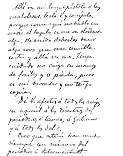 After the first issue of La Solidaridad was published, the writer Marcelo H. del Pilar, who himself was from the province of Bulacan, sent a letter to José Rizal, suggesting that he read the article of López Jaena. Del Pilar urged Rizal to write a letter in Tagalog to "las muchachas de Malolos," adding that it would be "a help for our champions [campoenes] there and in Manila."[30][36] At the time, Rizal was well known in the Philippines for his anti-clerical 1887 novel Noli Me Tángere.[37] In his reply to Del Pilar, Rizal shared the handwritten manuscript of the letter he wrote to "las malolesas."[38]