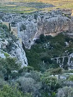 Ultimately Chadwick was proven correct and building of the water station commenced. Chambers were excavated into the south side of the valley, then connected to reservoirs. A bridge was erected over the valley to support a pipeline which led water to a reservoir in the high lying village of Nadur, another pipeline supplied water to a reservoir at Ta’ Cenc. The pumping mechanism was powered by coal,[4] which in 1949 was replaced by an electrical system.[5][6]