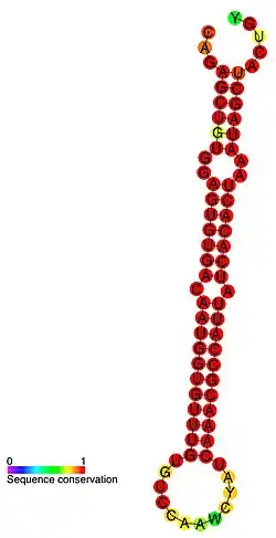 miR-122 was originally identified by cloning of tissue-specific microRNAs in mouse.[2] The liver-specific expression of miR-122 is conserved in zebrafish.[3] miR-122 expression increases during embryogenesis until it constitutes 72% of total miRNA in adult human liver, making it one of the most highly expressed miRNAs in any tissue.[4] In humans, miR-122 is encoded at a single genomic locus in chromosome 18. The primary miR-122 transcript (pri-miR-122) is a long non-coding RNA. Transcription is regulated by HNF4α.[5] The miR-122 hairpin precursor consensus shown here is predicted based on base pairing and cross-species conservation. The mature sequence is excised from the 5' arm of the hairpin.[2][6]