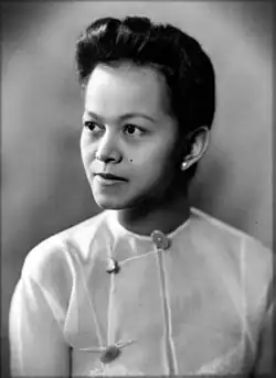 Born of Mon ancestry,[2] Mi Mi Khaing grew up during the British colonial rule of Burma and was educated in British schools.[3] She attended St. John's Convent School,[4] and gained first a BA (Hons) from Rangoon University and then a BSc from King's College London.[5] She married Sao Saimong, a noted scholar and a member of the royal family of Kengtung State, one of the Shan States. In addition to her writing career, she also established Kambawza College in Taunggyi and served as its principal.[2] In later life she lost her sight as the result of a brain tumour, but learnt to read and write in Braille.[5]