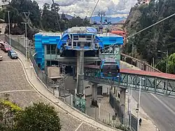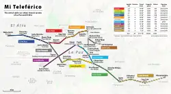 Mi Teleférico (Spanish pronunciation: [mi teleˈfeɾiko], English: My Cable Car), also known as Teleférico La Paz–El Alto (La Paz–El Alto Cable Car), is an aerial cable car urban transit system serving the La Paz–El Alto metropolitan area in Bolivia.[5] As of October 2019, the system consists of 26 stations (36 if transfer stations are counted separately per line) along ten lines: Red, Yellow, Green, Blue, Orange, White, Sky Blue, Purple, Brown, and Silver. Further lines and extensions are in planning or construction.[2]