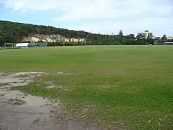 The chosen site presented a number of construction challenges because the southern half was a swamp and the northern half was on the steep slope of Nobby's Headland, an upthrust of schist about 50 m high at its highest point.[9] The challenges were met by the simple expedient of blasting the slope and dumping the rubble in the swamp, but with a consequent complete loss of topsoil that created enduring problems for many years.[9]