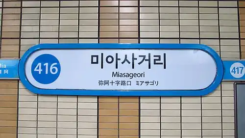 Miasageori Station is a station on the Seoul Subway Line 4. Its name means "four-way junction in Mia-dong." It is located in Mia-dong, Gangbuk-gu, Seoul. It was previously called Miasamgeori (미아삼거리), until December 26, 2013.[2][1]