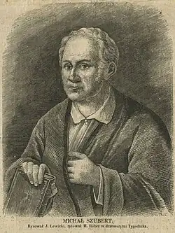 Szubert (originally Schubert) was born in a German origin family at Ząbki near Warsaw to Bogumił who served in the court of Brühl and Joanna née Rudzka. Educated at the Warsaw Lyceum, he went to Paris in 1809 and attended the lectures of the botanists Charles-François Brisseau de Mirbel and Antoine Laurent de Jussieu. He contributed to Mirbel's Éléments de physiologie végétale et de botanique (1815). Returning to Poland in 1813 he taught botany at the Lyceum and forestry at the School of Law and Administration. In 1816, he was appointed to the newly founded University of Warsaw as a professor of botany and worked there until the university was closed in 1831 following the November Uprising. He was also in charge of the botanical garden of the palace from 1816 and in 1818 he founded a new botanical garden in the Royal Łazienki Park which he directed until 1846. He collected extensively for his herbarium while at the university and his students included Jakub Ignacy Waga and Wojciech Jastrzębowski. He served in the artillery during the November Uprising of 1830–31. From 1836 he served as a professor of botany at the Warsaw School of Pharmacy.[1][2]