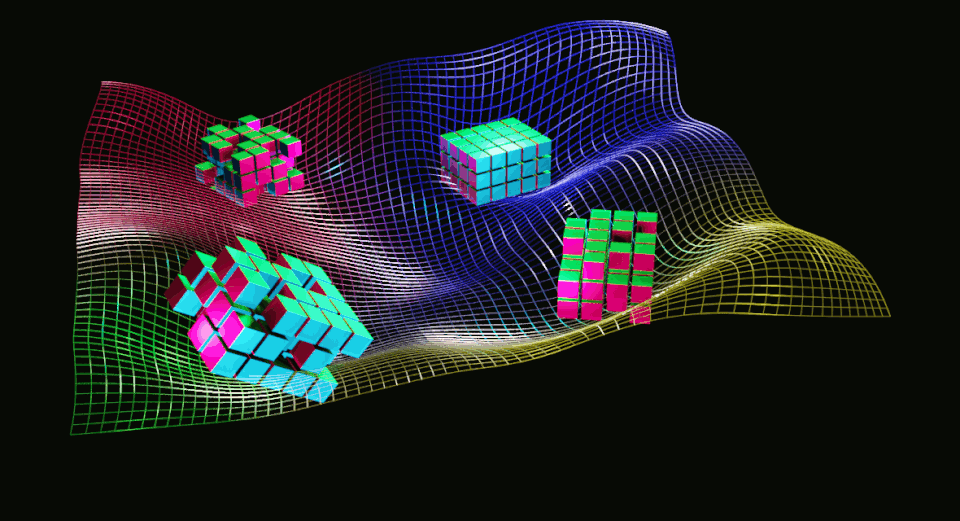 The animated image below depicts a dynamic production environment that hosts software entities and the dents they imprint on its space's fabric.