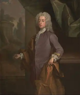 Dahl kept advancing in reputation, and in 1696 he painted the portrait of Charles Seymour, 6th Duke of Somerset who found him to his liking even though the Duke was known for being a very despotic and difficult man to handle.[21] The Duke continued to hire Dahl and for over 20 years he painted members of the Duke's family.[21] In 1705 he got the chance of painting several versions of the portrait of Prince George of Denmark.[22] It was undoubtedly through the Prince that he came into the circles around Queen Anne, whose portrait he also painted.[21]
