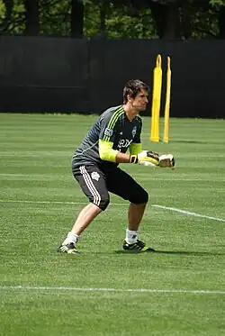 Gspurning returned on 6 June, after missing 6 MLS games and being replaced by Meredith and Andrew Weber.[21] He trained through mid-July to return and started in goal during a 2–1 win over the Colorado Rapids on 28 July.[22][23] Gspurning earned his first shutout since his injury against the Los Angeles Galaxy in a 4–0 win in August,[24] lost in the U.S. Open Cup Final against Sporting Kansas City in a penalty shootout, having his save on Paulo Nagamura re-taken after a 1–1 draw.[25] Gspurning played 2 matches in the 2012–13 Champions League, winning 3–1 over Caledonia AIA in Trinidad and Tobago in late August,[26] and winning 3–2 over Honduran club Marathón after earning a yellow card and conceding 4 penalties over the 2 games.[27] He earned an assist on Fredy Montero's goal against the Portland Timbers on September 15 off of a punt,[28] and later started all four MLS Cup Playoffs games for the Sounders before they were eliminated in the Conference Finals by the LA Galaxy.[29] Gspurning finished 2012 with 21 regular season games, conceding 15 goals for a 0.73 GAA, the third lowest in MLS history.[30][31]