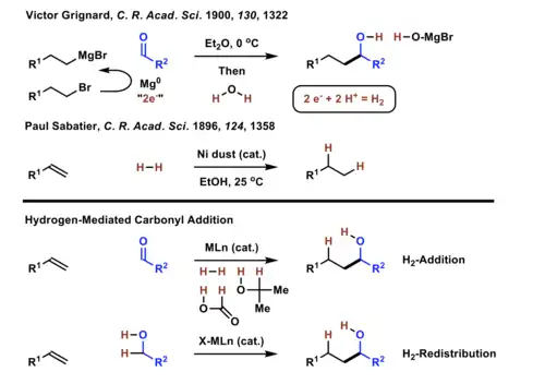 - ^ a b c Kim, Seung Wook; Zhang, Wandi; Krische, Michael J. (2017). "Catalytic Enantioselective Carbonyl Allylation and Propargylation via Alcohol-Mediated Hydrogen Transfer: Merging the Chemistry of Grignard and Sabatier". Accounts of Chemical Research. 50 (9): 2371–2380. doi:10.1021/acs.accounts.7b00308. PMC 5641472. PMID 28792731.
