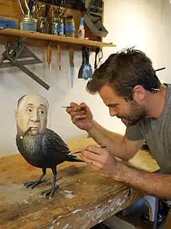 Titled "King Cuts", Leavitt created a series of wood sculptures devoted to famous film directors in 2016. "Tim Burton, Alfred Hitchcock and George Lucas have all been treated to one of Mike's makeovers, which involves merging stars from behind the silver screen with their most iconic on-screen characters" (Creative Boom[62]) Leavitt carved the 1/4 scale, 18-inch (46 cm) sculptures in wood and finished the carvings with acrylic paint.[63] "King Cuts" furthered the central themes in Leavitt's art of exposing taste-makers behind the scenes, and work consuming a creator's body. "The lives of many great film directors are undoubtedly consumed by their work, intertwined with the stories, characters and settings they seek to convey."[64] Leavitt said, "I'm good at sculpting the likeness of a face, so it gets interesting when it's a face maybe you wouldn't recognize off the bat, but you know who it is. You know that person's work. It's the face behind the mask, the person behind the camera, the wizard behind the curtain."[65] [66]