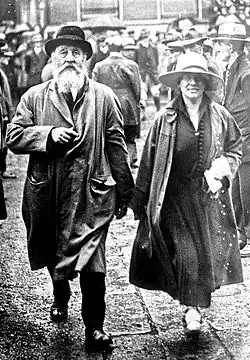 In March 1913 a protracted strike broke out at the Sligo Docks. In May O'Flanagan visited the strikers to show his solidarity and advised them to continue insisting for their rights.[12] It has been suggested that this display of socialism prompted the Bishop to move O'Flanagan to Cliffoney.[12] When the advanced nationalist Keating Branch took control of the Gaelic League, O'Flanagan was elected to the Standing Committee for two years.[11] A recently discovered photograph shows O'Flanagan in a large group, many of whom were advanced nationalists at a meeting of the Gaelic League outside Galway Town Hall in August 1913.[19]