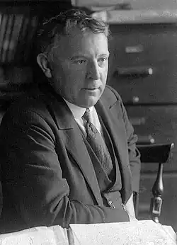 Puntervold placed himself on the right wing of the party, which held control of the party by and large until 1918.[8] In 1920 he was more or less denounced by Edvard Bull, Sr. who wrote in Det 20de Aarhundre of "right-wing socialism and puntervoldery".[9] When the Labour Party split in 1921, Puntervold joined the more right-wing Social Democratic Labour Party, and became a leading figure in this party.[3] Writing in Arbeider-Politikken, he was a part of the early supporters of such a new party.[10] He was also chairman of Arbeider-Politikken, which became the official party newspaper, from 1920 to 1927.[1] He took part at the founding congress of the Labour and Socialist International in 1923; the other Norwegian delegates were Magnus Nilssen, Arne Magnussen and Olav Kringen.[11]