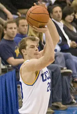 After years of being a role player for the Bruins, Roll became a leader of the team as a fifth-year senior in 2009–10.[9][10] He was pushed into his new role after the departure of seniors Shipp, Darren Collison, and Alfred Aboya from the prior season.[8] Moreover, he would have been only the fourth option on the team behind Kevin Love, Westbrook, and Holiday, had they not declared early for the National Basketball Association.[11] Roll prepared for the increased workload during the offseason with a workout regimen that included basketball workouts twice a day, ball-handling drills, shooting 500 times daily, and a weight-training program to strengthen his legs and back. UCLA's roster that season included six freshmen and six sophomores.[12] Roll, Nikola Dragović, and James Keefe were the only seniors on the team, and Keefe's season ended prematurely after season-ending shoulder surgery.[11] UCLA's season ended in the semifinals of the 2010 Pacific-10 Conference tournament with an 85–72 loss to California, despite a career-high 27 points from Roll.[11] He averaged 22.5 points in the two tournament games, and was named to the All-Tournament team.[13] The Bruins finished the season 14-18 and did not qualify for the NCAA tournament for the first time in six seasons.[14] Roll earned first team All-Pac-10 honors, and was named the Bruins' most valuable player after leading the team in scoring with 14.1 points per game. He also led UCLA with 3.6 assists per game,[15] and set the school record for most career games played (147), surpassing Collison and Aboya's previous mark (142).[16] Roll was selected to play in the Reese's College All-Star Game during the Final Four.[17]