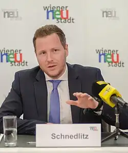 Michael Schnedlitz (born 13 March 1984) is an Austrian far-right politician of the Freedom Party. Since 2019, he has been a member of the National Council.[1] In 2020, he was elected general secretary of the Freedom Party.[2] He was a member of the Landtag of Lower Austria in 2018 and has served as deputy mayor of Wiener Neustadt since 2015.[3]