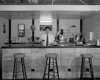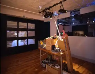 Art historian David Joselit called It Starts at Home (1982, first shown at the Whitney Museum in the installation Mike's House) "a watershed work" in video art that placed avant-garde practice within the debased rhetoric of the middlebrow TV sitcom and inverted the usual relationship between audience and spectacle.[4][18][6] In its play on public access TV, Mike's mundane domestic life is being beamed to the world due to a cable installation snafu, making him inexplicably famous;[4][33][26] among the work's other features were a purported agent (literally, a "deal-making piece of fur" named "Bob") and various disorienting sight gags, doublings and mismatches between the installation's home (also the cable-show set) and the video.[33] In the satirical installation Government Approved Home Fallout Shelter/...Snack Bar (1983),[34] Smith examined cold-war anxieties by transforming Mike's rec room into a fallout bunker (based on a 1950s FEMA manual), complete with a yellow concrete snack bar and a video game programmed to always lose.[28][10][3]