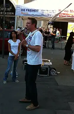 He has cited the death of his colleague Ralph Burkei in the 2008 Mumbai attacks, during which they were in contact via SMS, as an important event for his anti-Islam beliefs, while stating that he had read the Quran after the September 11 attacks.[7] He began contributing to the counter-jihad blog Politically Incorrect under the pseudonym byzanz,[8][12] and was a member of the CSU until 2011, when he left the party and joined the German Freedom Party.[7] He was elected to the federal executive board of the German Freedom Party, but due to his radical Islamophobic attitude, his election led to the resignation of several state executives and many members.[13] He had previously been relieved of his positions in the party after a blog post that called for Muslims to be forced to leave the country unless they renounced their faith.[14] In 2012, he spoke at international counter-jihad rallies in Aarhus, Denmark,[15] and in Stockholm, Sweden.[16]