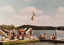 The camp was the first summer skiing training facility in North America to offer aerials training on water ramps. Over 6-day sessions, campers trained for aerials on the ramps – a 25-foot and a 40-foot-high ramp – and on trampolines, and practiced ski ballet on a mechanical moving carpet.[14] Close to 50 campers took part in the first session of the camp in July 1975.[4] In July 1976, Michel Daigle hosted a second freestyle summer camp in Quebec, during which were held the first World Summer Aerials Championships.[14]