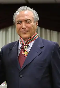 Michel Miguel Elias Temer Lulia (Brazilian Portuguese: [miˈʃɛw miˈɡɛw eˈli.ɐs ˈtemeʁ luˈli.ɐ]; born 23 September 1940) is a Brazilian politician, lawyer and writer who served as the 37th president of Brazil from 31 August 2016 to 1 January 2019. He took office after the impeachment and removal from office of his predecessor Dilma Rousseff. He had been the 24th vice president since 2011 and acting president since 12 May 2016, when Rousseff's powers and duties were suspended pending an impeachment trial.[1]
