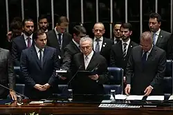 The Senate's 61–20 vote on 31 August 2016 to remove Rousseff from office meant that Temer succeeded her and served out the remainder of her second term. In his first speech in office, Temer called for a government of "national salvation" and asked for the trust of the Brazilian people.[2] He also signaled his intention to overhaul the pension system and labor laws, and to curb public spending.[3]