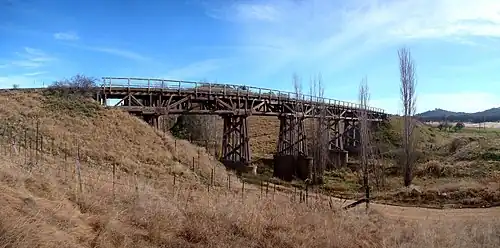 The Michelago Rail Bridge over Ingalara Creek is a seven-span timber truss viaduct. Each main span is 12.8 metres (42 ft) centre-to-centre of timber trestles.[1][2]