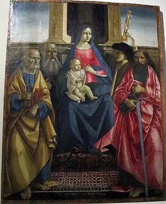The artist was previously only known as the Master of the Lathrop Tondo, until the works could be attributed to Michelangelo di Pietro in 1985. His works are characterized by an enameled, metallic finish and a decorative, linear Florentine School style.[1] There is now approximately thirty paintings that have been attributed to him. He is known to have worked in and around Lucca. Apparent influences include Domenico Ghirlandaio and Filippino Lippi.[1] The parish church of Santa Maria Assunta houses a fifteenth-century altarpiece painted by Michelangelo di Pietro.[2]